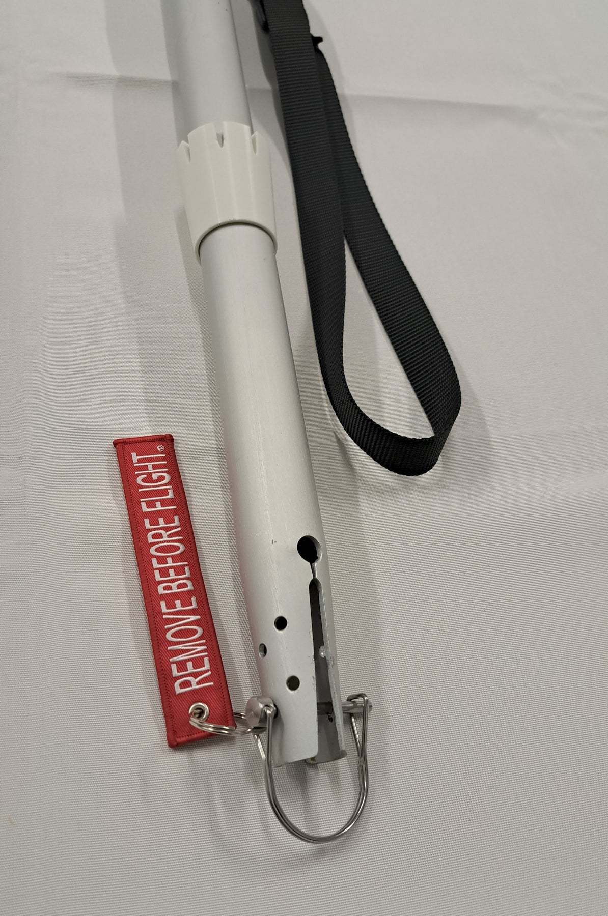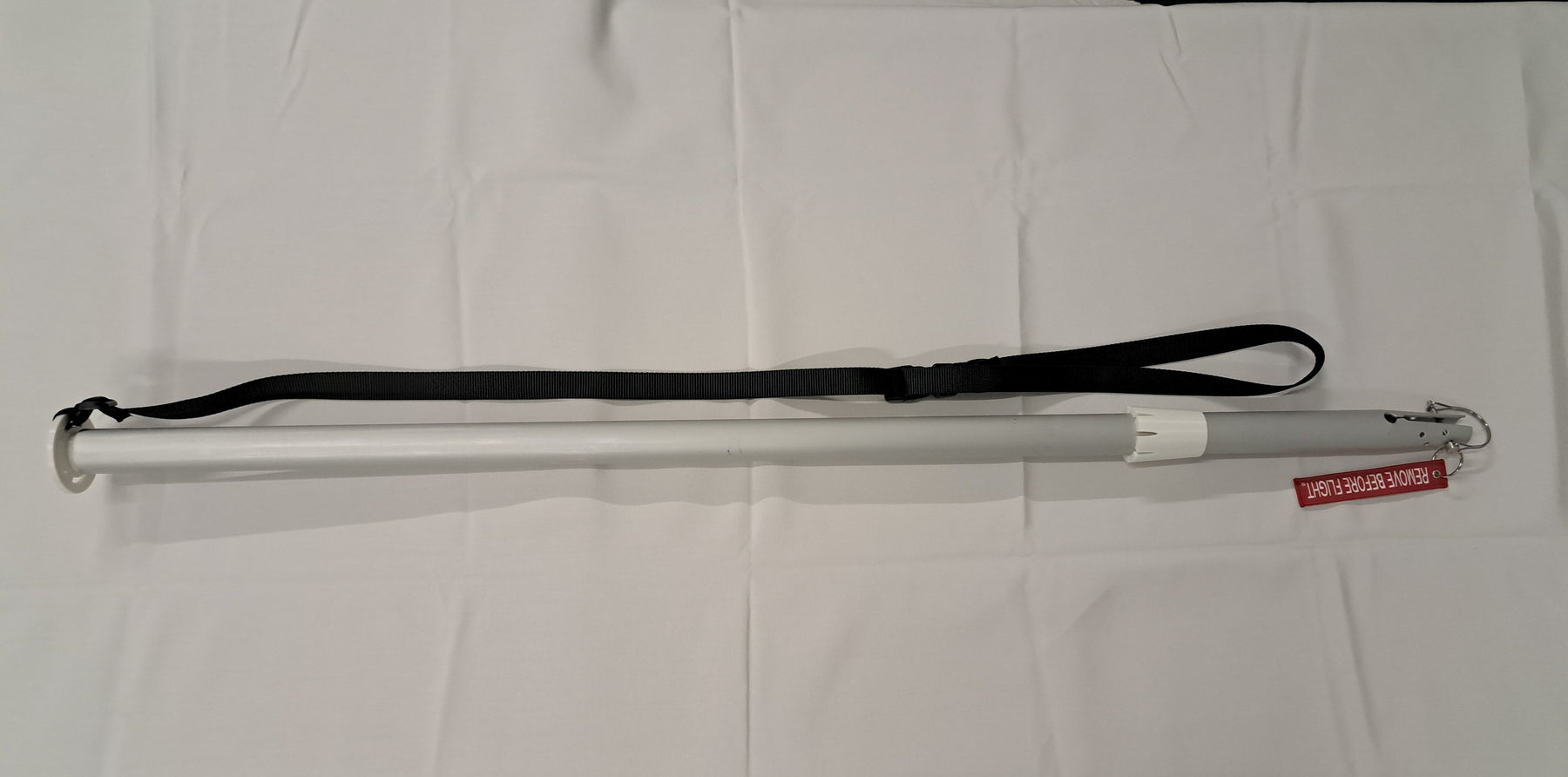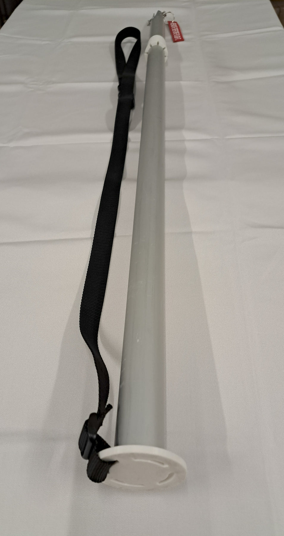 This extension includes a pin clip to secure the cantilever from below a rod holder, when accessible. It also includes a 1-inch-wide strap down cap, to secure the shade system otherwise. Simply attach the strap to any convenient tie down point.