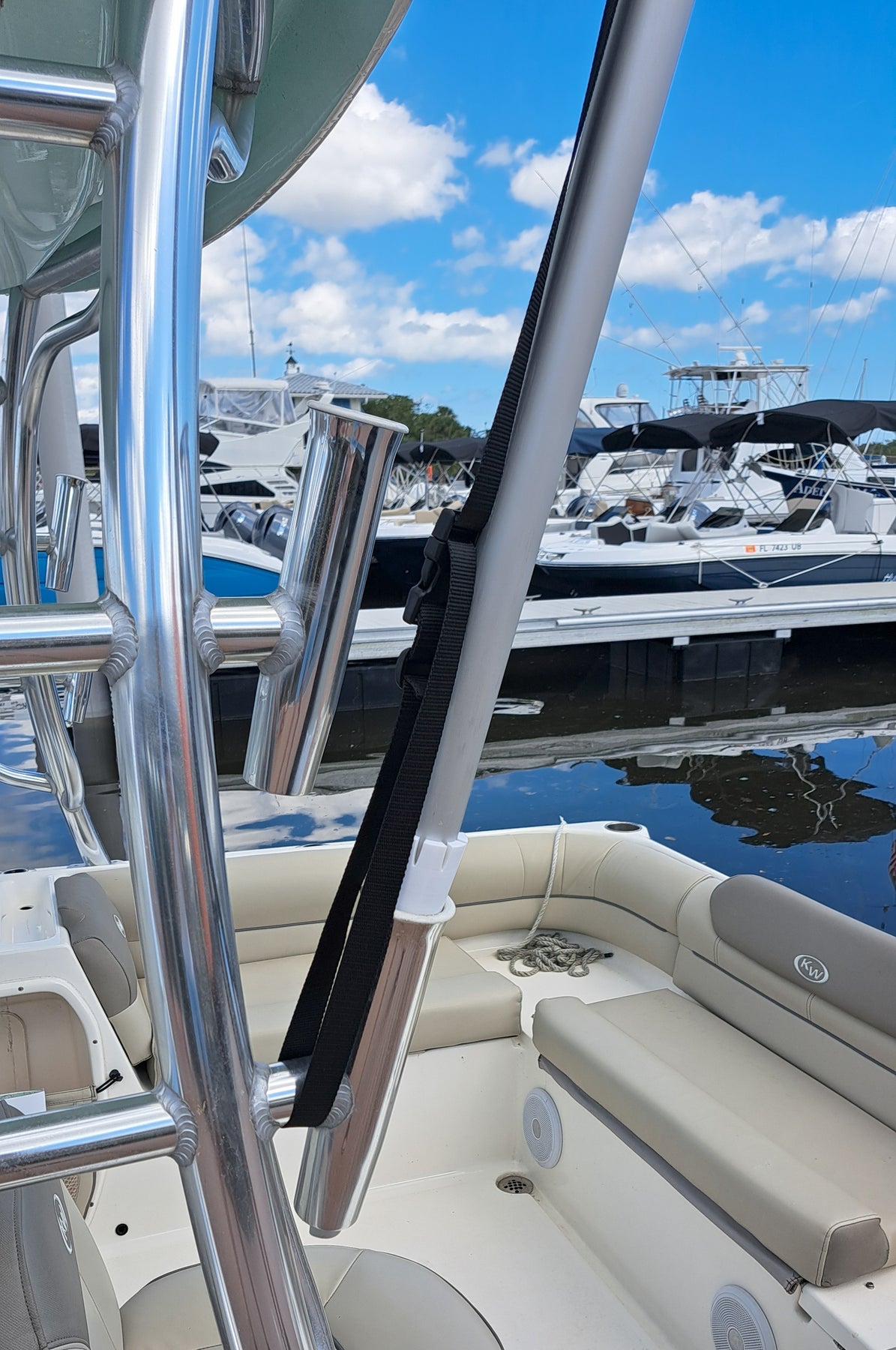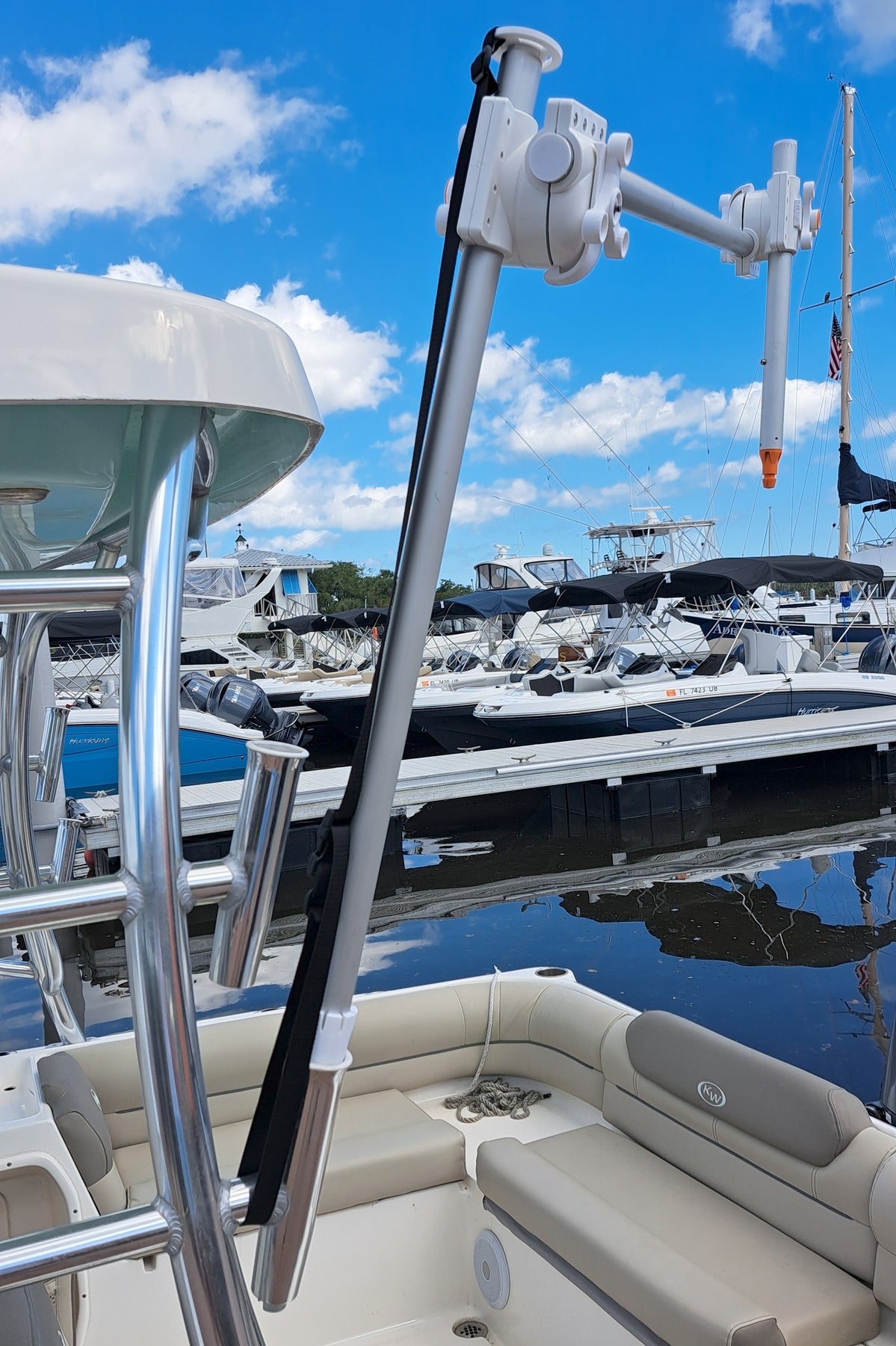 When available rod holder mounts are not directly overhead, you can use an extra long mount tube and insert the RocketShādē at waist high or gunnel level rod holders. This solution works well with hardtop runabouts or catamarans without T-tops.